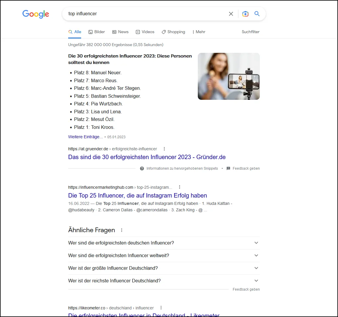 Die richtigen Influencer:innen über eine schnelle Google-Suche zu finden, kannst du vergessen! Nur ein kleiner Teil der Influencer:innen kann überhaupt über eine Google-Suche gefunden werden. Und diejenigen, die du findest, passen entweder nicht zu dir und deiner Brand oder sind Influencer:innen mit vielen Follower:innen, die möglicherweise nicht in das Budget deines Unternehmens passen. Um unsere These zu untermauern, haben wir bei Google nach dem Stichwort „Top Influencer“ gesucht. Hier ist das Top-Ergebnis im Snippet: