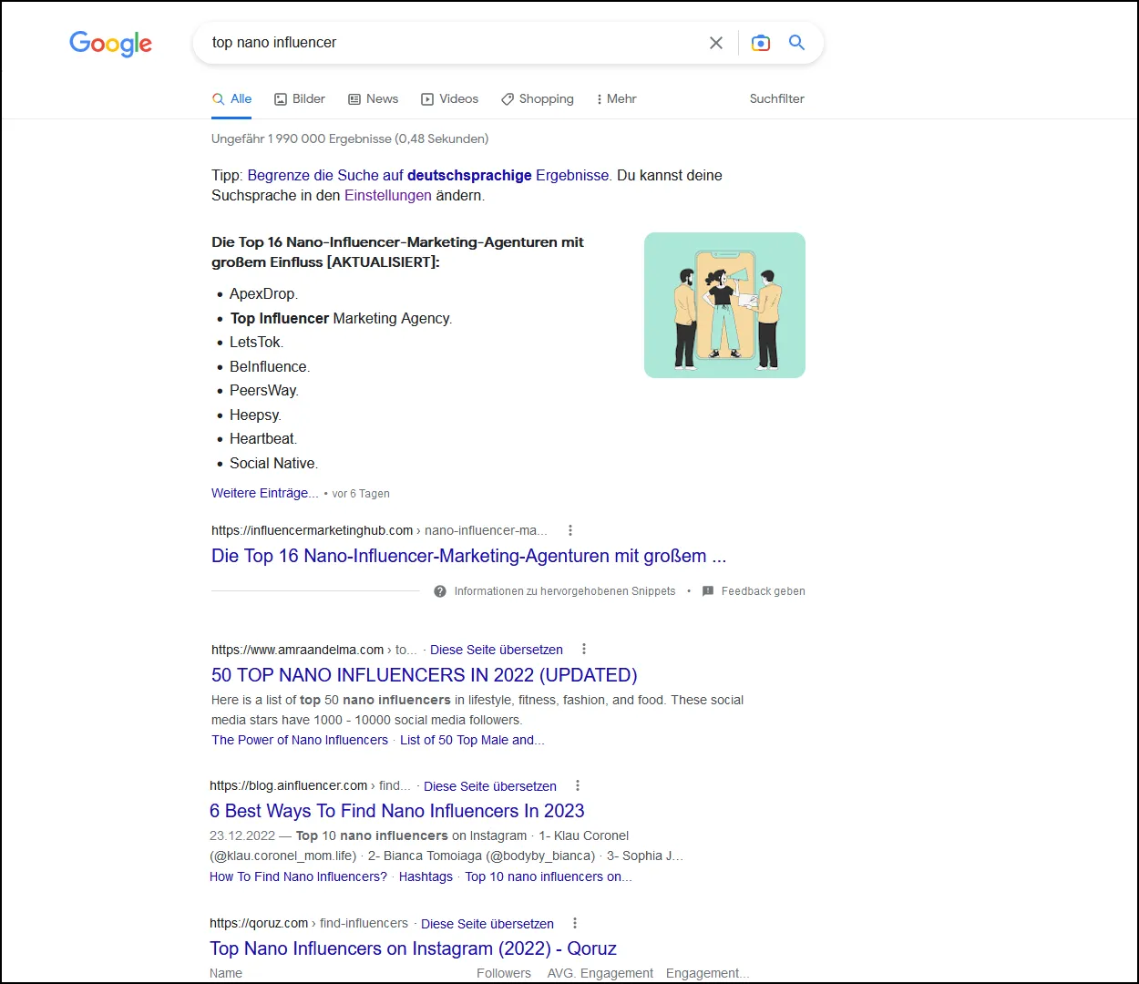 Sieh dir das erste Ergebnis an. Das ist eine Liste von Influencer:innen mit Millionen von Follower:innen. Obwohl wir in unserer Suchanfrage explizit nach Nano-Influencer:innen gesucht haben, zeigt Google uns einen Artikel mit einer Liste von Influencer:innen, die jeweils Millionen von Follower:innen haben (und noch dazu eine schlechte Engagement-Rate).