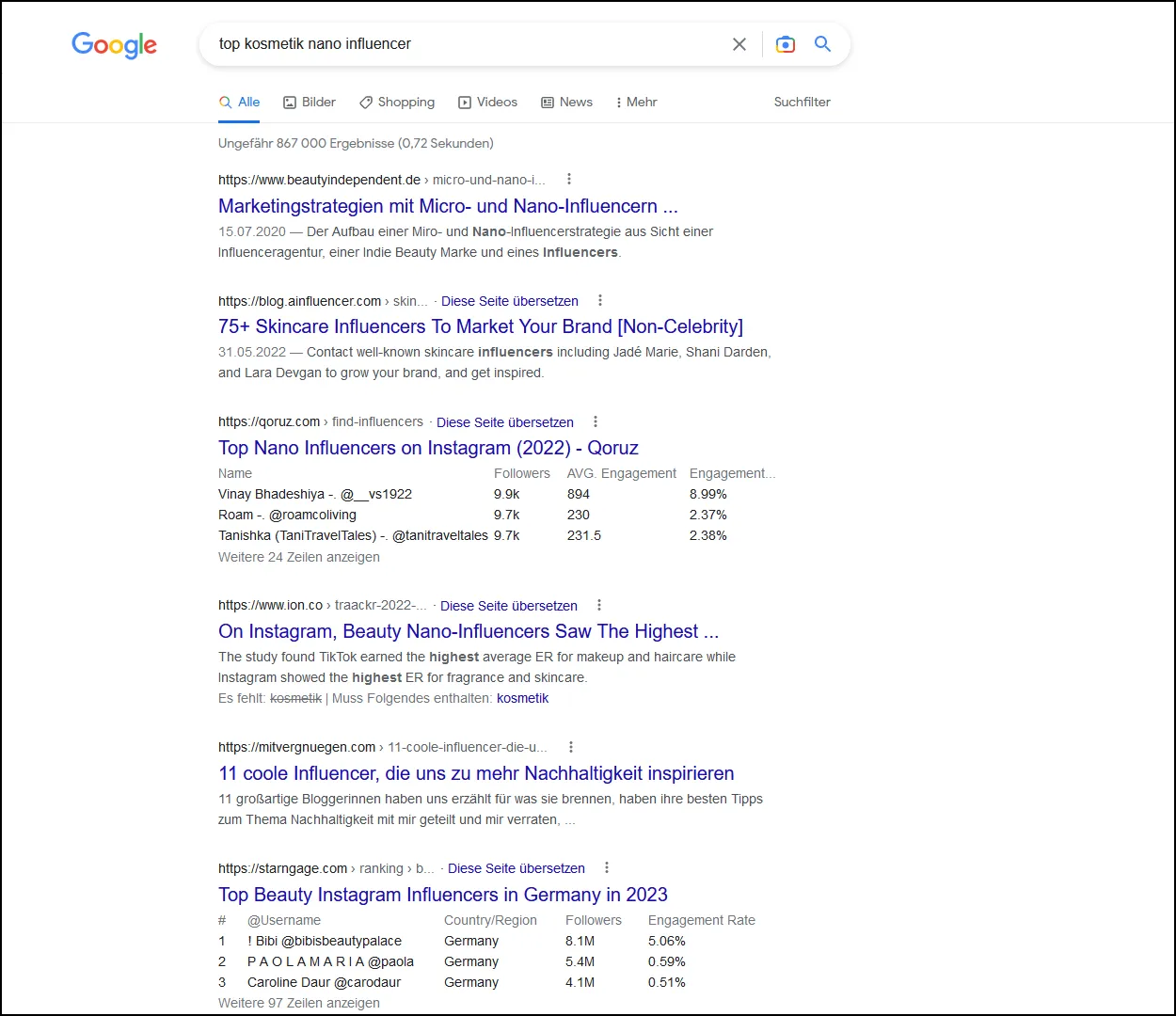 Das ist zwar eine gute Liste. Sie gibt dir aber weder weitere Einblicke in die Nische, in der sich diese Influencer:innen bewegen, noch erfährst du etwas über ihr Publikum oder ihre Engagement-Rate. Aber was, wenn du nach Nano-Influencer:innen für die Kosmetik-Branche suchst? Natürlich kannst du es mit Suchanfragen wie „top cosmetic nano influencers“ probieren. Genau das haben wir gemacht, doch haben wir keinen Artikel gefunden, der sich ausschließlich auf Nano-Influencer:innen im Bereich Kosmetik konzentriert. Die Ergebnisse waren viel zu allgemein und unspezifisch – absolut nicht hilfreich. Die Influencer:innen, die man per Google-Suche findet, sind also nicht ideal für eine ergebnisorientierte Kampagne.