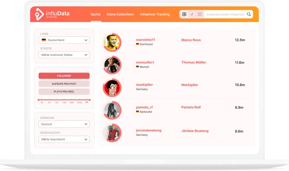 influData macht es für Unternehmen einfacher, Influencer:innen zu finden und zu analysieren, Influencer:innen mit Fake-Follower:innen zu erkennen, ihre Influencer-Marketing-Kampagnen zu verfolgen und vieles mehr.