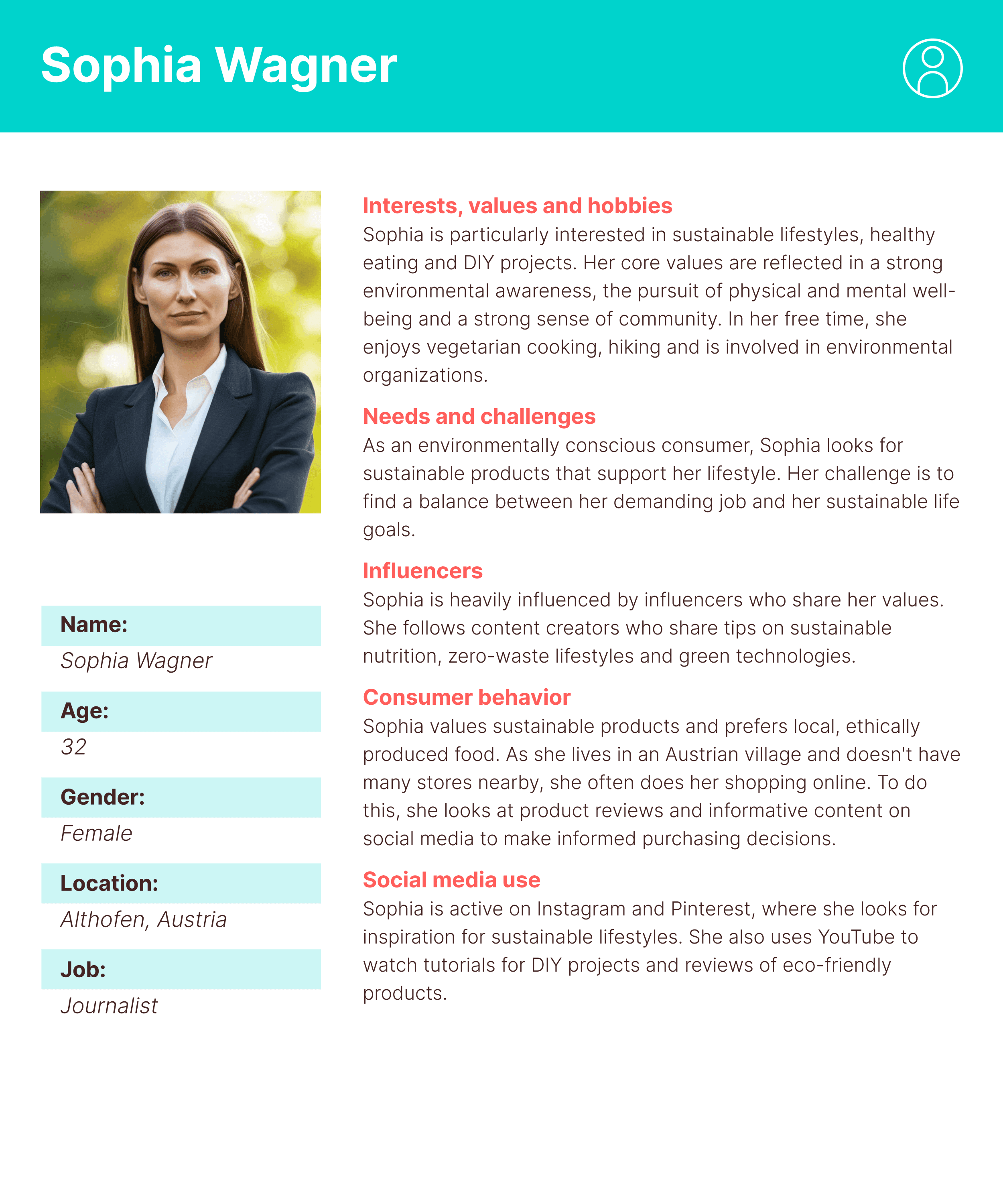Consumer behavior: Sophia values sustainable products and prefers local, ethically produced food. As she lives in an Austrian village and doesn’t have many stores nearby, she often does her shopping online. To do this, she looks at product reviews and informative content on social media to make informed purchasing decisions.
