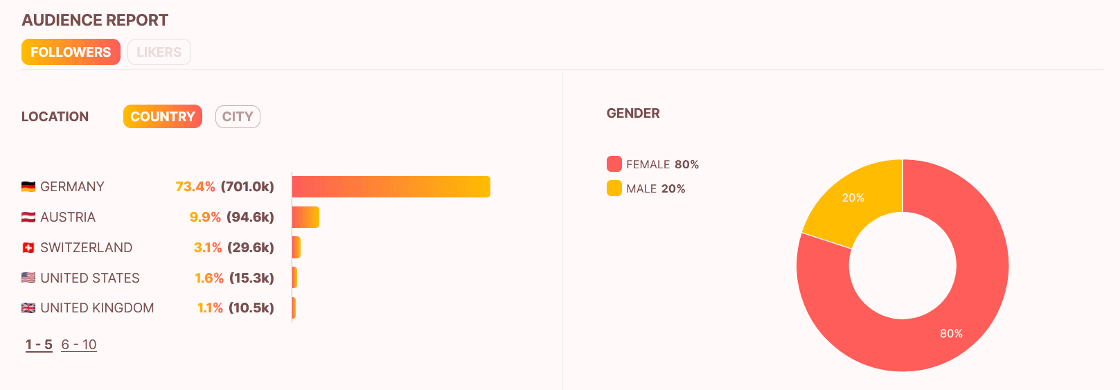 Another relevant aspect of checking an influencer profile is the audience report provided by some influencer search platforms. This report provides detailed insights into the demographic characteristics of a content creator’s followers, including age, gender, language, and origin. By analysing this data, you can determine whether the composition of the influencer’s community matches your own target group. For example, if your products and services are aimed exclusively at the DACH region, but the creator’s followers are predominantly from the USA, there is no brand fit.