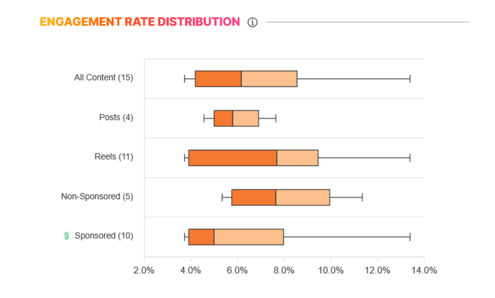 In addition to engagement rate itself, you should also consider the range or fluctuation of engagement across an influencer’s content. Look at individual posts to determine where engagement rates fall. This will help you assess whether an influencer’s overall engagement rate is affected by outliers, if engagement fluctuates significantly, or if it remains stable within a specific range. For planning with a creator, this is of great importance, as it allows you to better estimate the engagement rate you can expect. A narrow range of engagement indicates stable performance and enables precise planning, whereas a broad range suggests fluctuations, which may offer potential for high reach but also pose the risk of underperformance. In short, you are on safer ground when an influencer’s engagement remains within a consistent range. A tool like influData can handle this work for you and provide such ranges without requiring you to manually check all of an influencer’s individual content pieces.