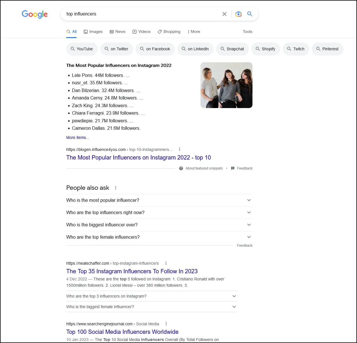 Forget about finding the right influencers via a quick Google search! Only a small part of influencers can be found via a quick Google search. And the ones you will find, are either not suited for you or will be influencers with large followings – which may not be suited for your company’s budget. To prove our point, we looked up the keyword “top influencers” on Google, and here’s the top result with the featured snippet.