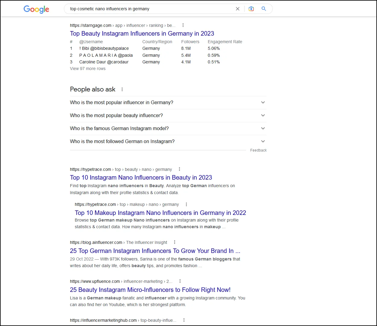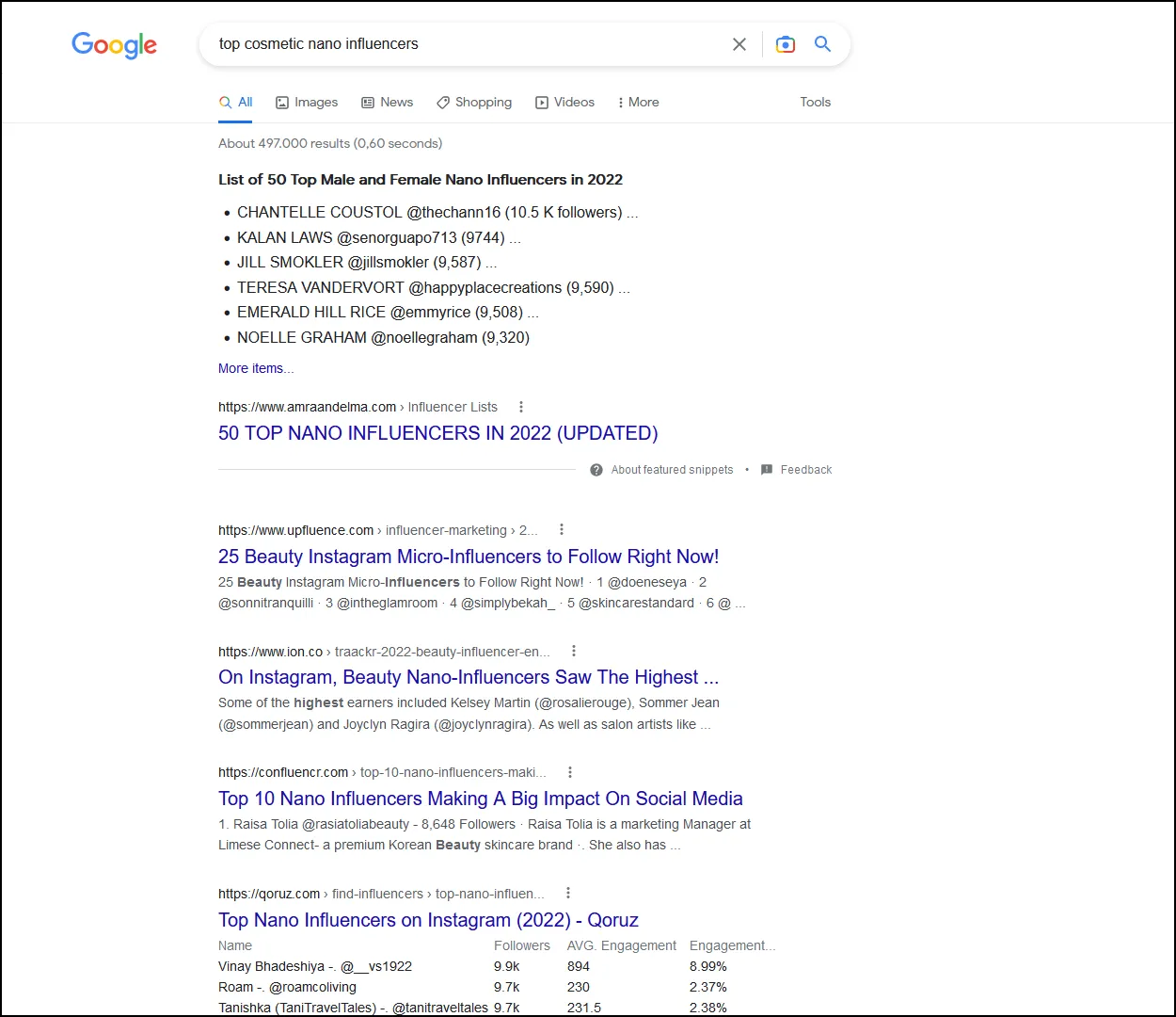 This list is good, but it does not offer you any more insights into the niche these influencers are in, their audience, or their engagement rate. But what if you’re looking for cosmetic nano-influencers? Well, you can always look up a keyword like “top cosmetic nano influencers.” We did exactly that, but didn’t come across an article that focused solely on cosmetic nano influencers. The results were generic and absolutely not fitting. The influencers found via Google search are not perfectly suited to set up a results-driven campaign.