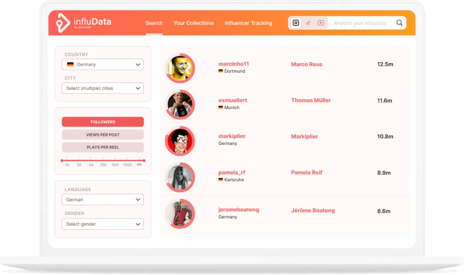 With an influencer discovery tool like influData, you can search and analyze creators worldwide. The platform offers intuitive discovery options and helps brands narrow down their influencer search by applying filters like location, social media platform, views per post, plays per reel, followers, language, gender, and more. These results can further be analyzed to assess their suitability for brand partnerships by examining the follower history, posting frequency, engagement levels, brand and media value, as well as audience insights. Additionally, you can find out if this account was engaged in any kind of fake activities as well as compare the influencers’ performance to similar creators. It’s literally impossible to achieve this level of granularity and depth via manual searching. Lastly, you’ll also be able to compare the performance of different influencers side-by-side.